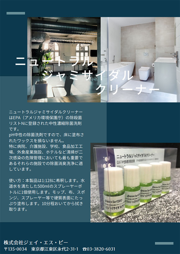 ニュートラルジャミサイダルクリーナーはEPA(アメリカ環境保護庁)の除殺菌リストNに登録された中性濃縮除菌洗剤です。