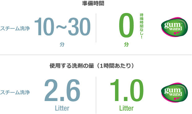 待機時間:スチーム洗浄 10~30分/ガムワンド 0分(待機時間なし!)、 使用する洗剤の量(1時間あたり):スチーム洗浄 2.6L/ガムワンド 1.2L